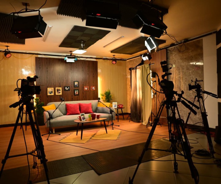 Cabina de realización, sistema ifb, Teleprompter, hasta 8 cámaras y enlaces SRT. Internet punto a punto estable. aire acondicionado, camerinos, catálogos de mobiliario y escenografías personalizadas.